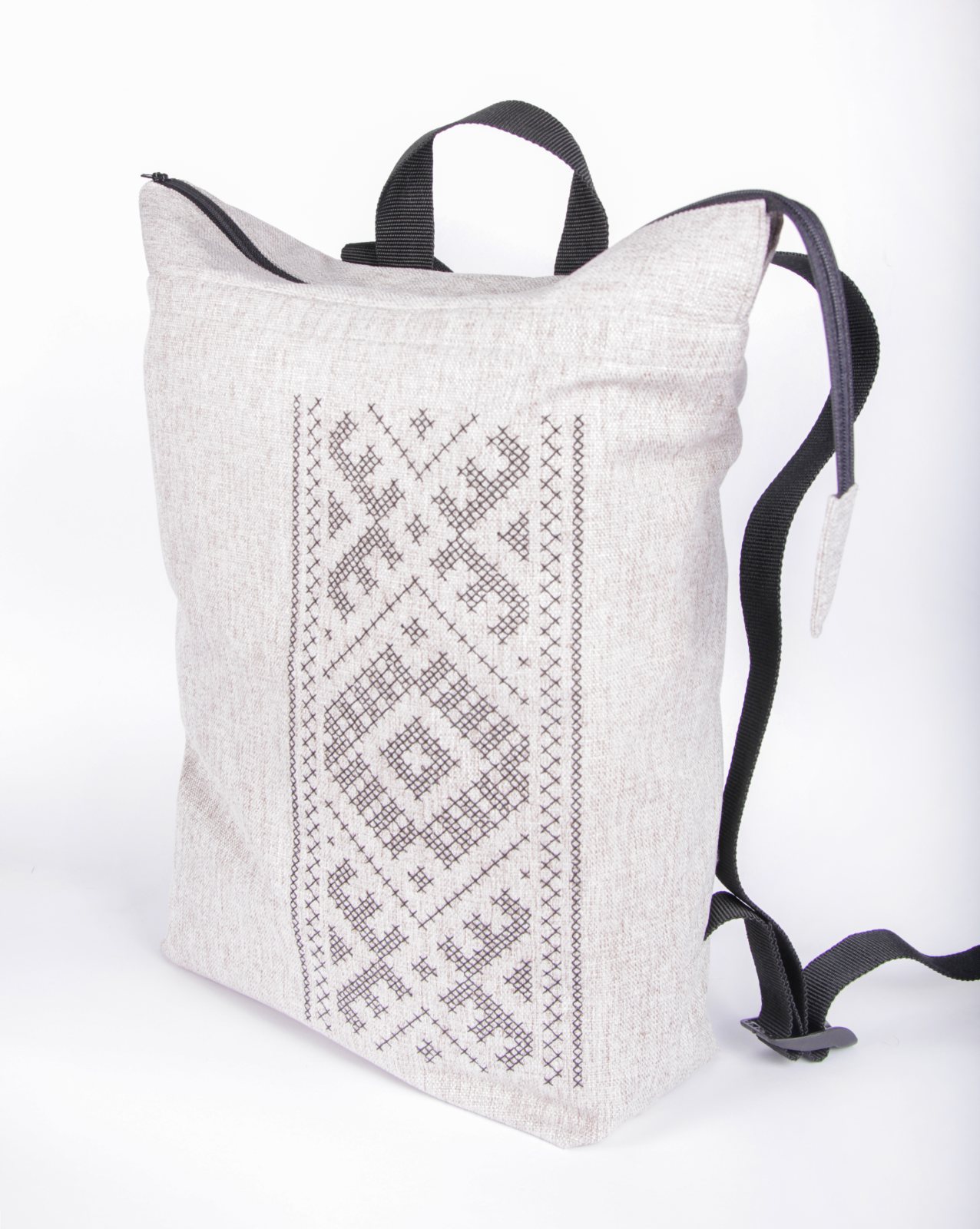 The bag is made of strong water-repellent fabric. Inside polyester lining and zippered inner pocket measuring 20×10 cm. The design of the product uses the Harju-Jaani belt pattern. The bag can be ordered as both a backpack and a shoulder bag. Please make your choice in the “Bag type” box.